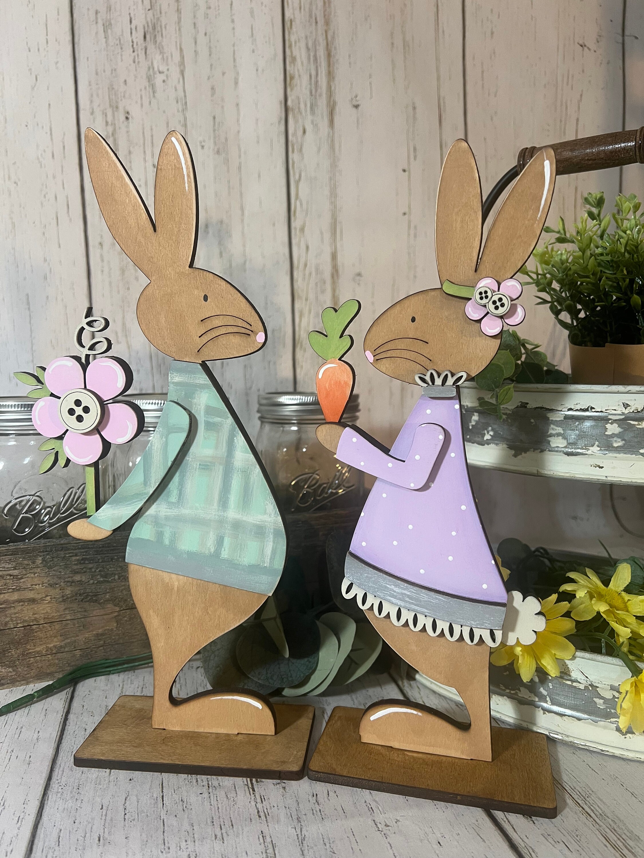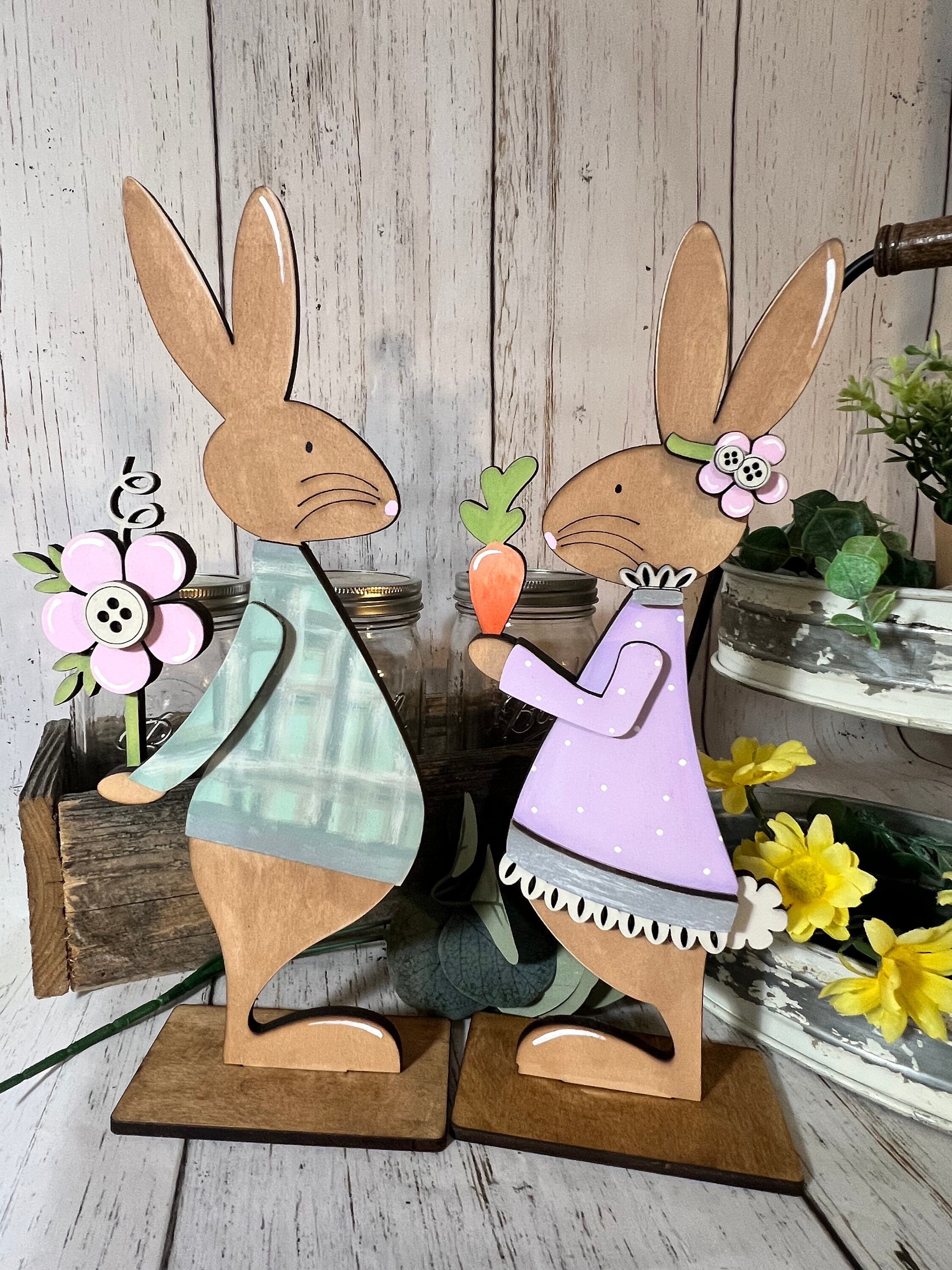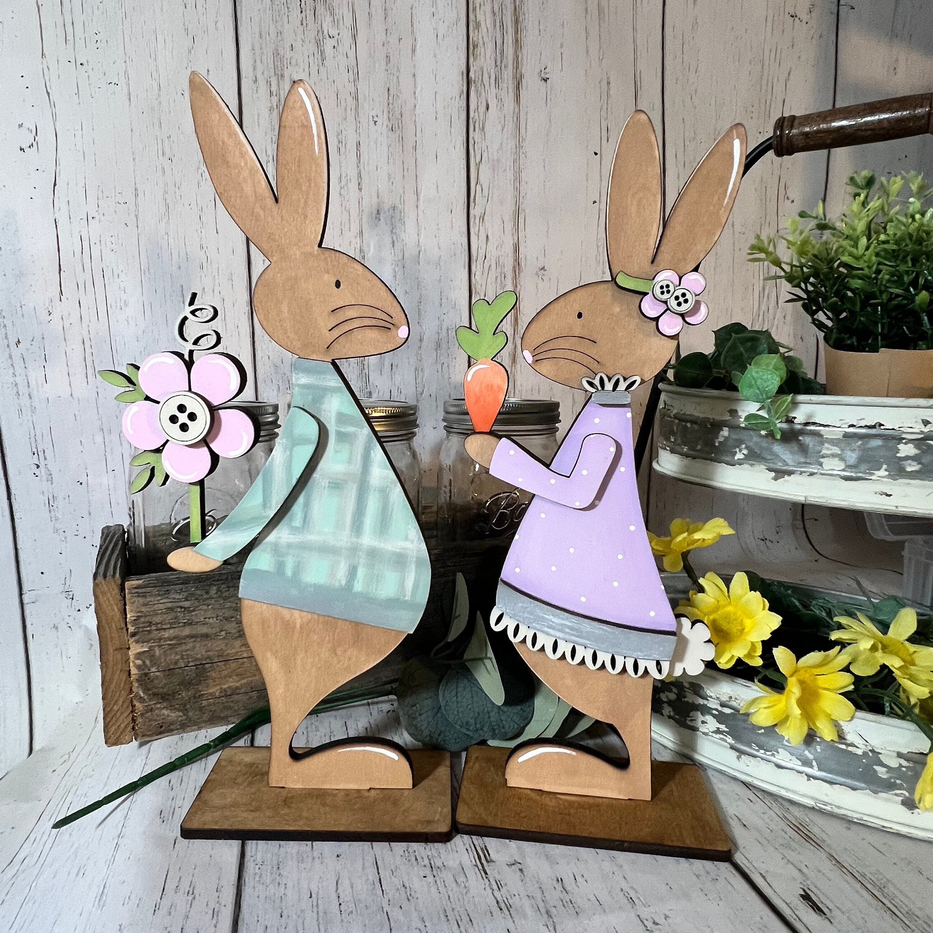 This wooden Easter bunny décor set includes two coordinating bunny figures designed to sit securely on shelves, mantels, tiered trays, countertops, or tabletops. One bunny wears a soft blue outfit holding a spring flower, while the other is dressed in a lavender dress holding a bright carrot, creating a playful and heartwarming scene that instantly adds seasonal charm.