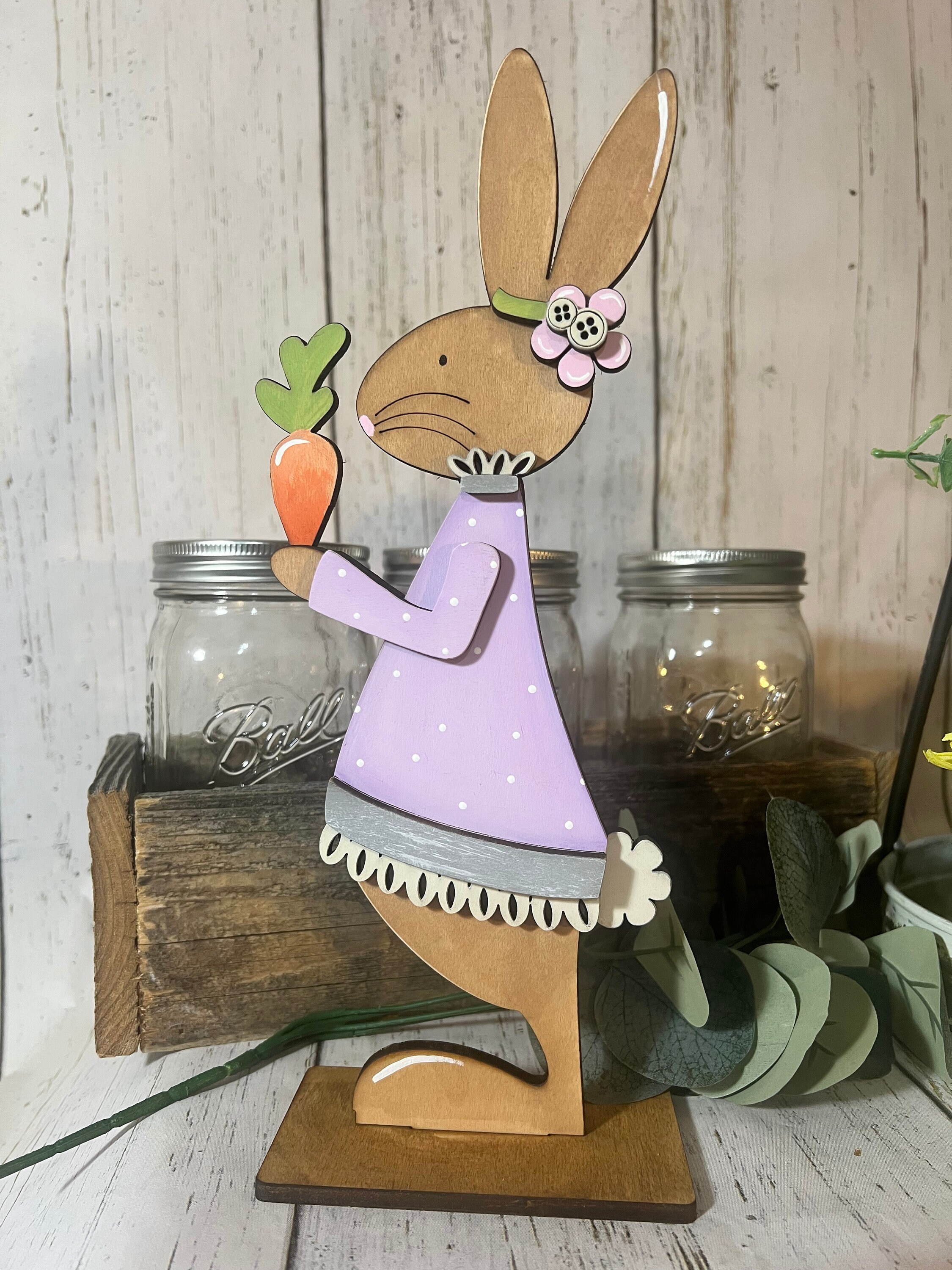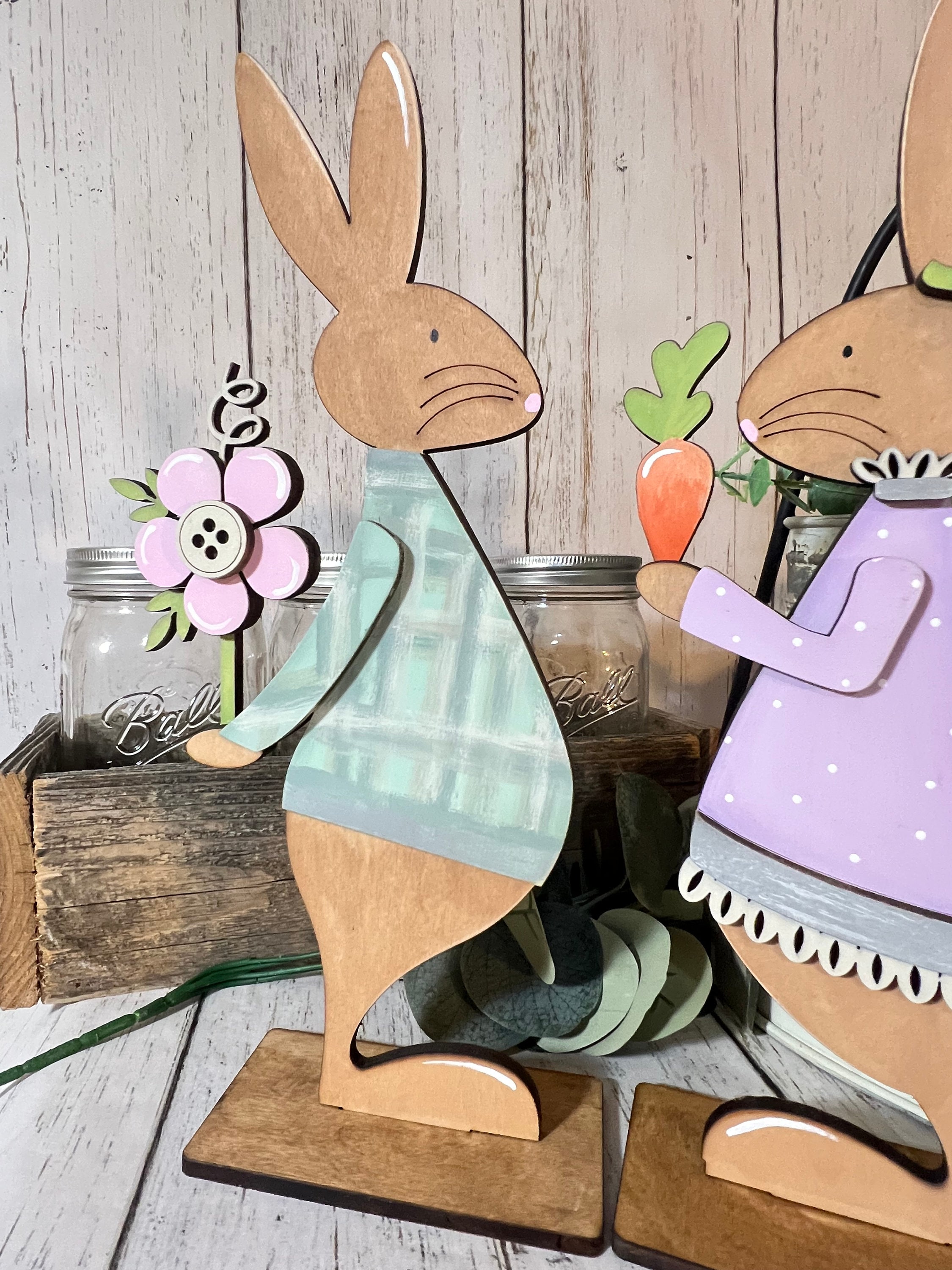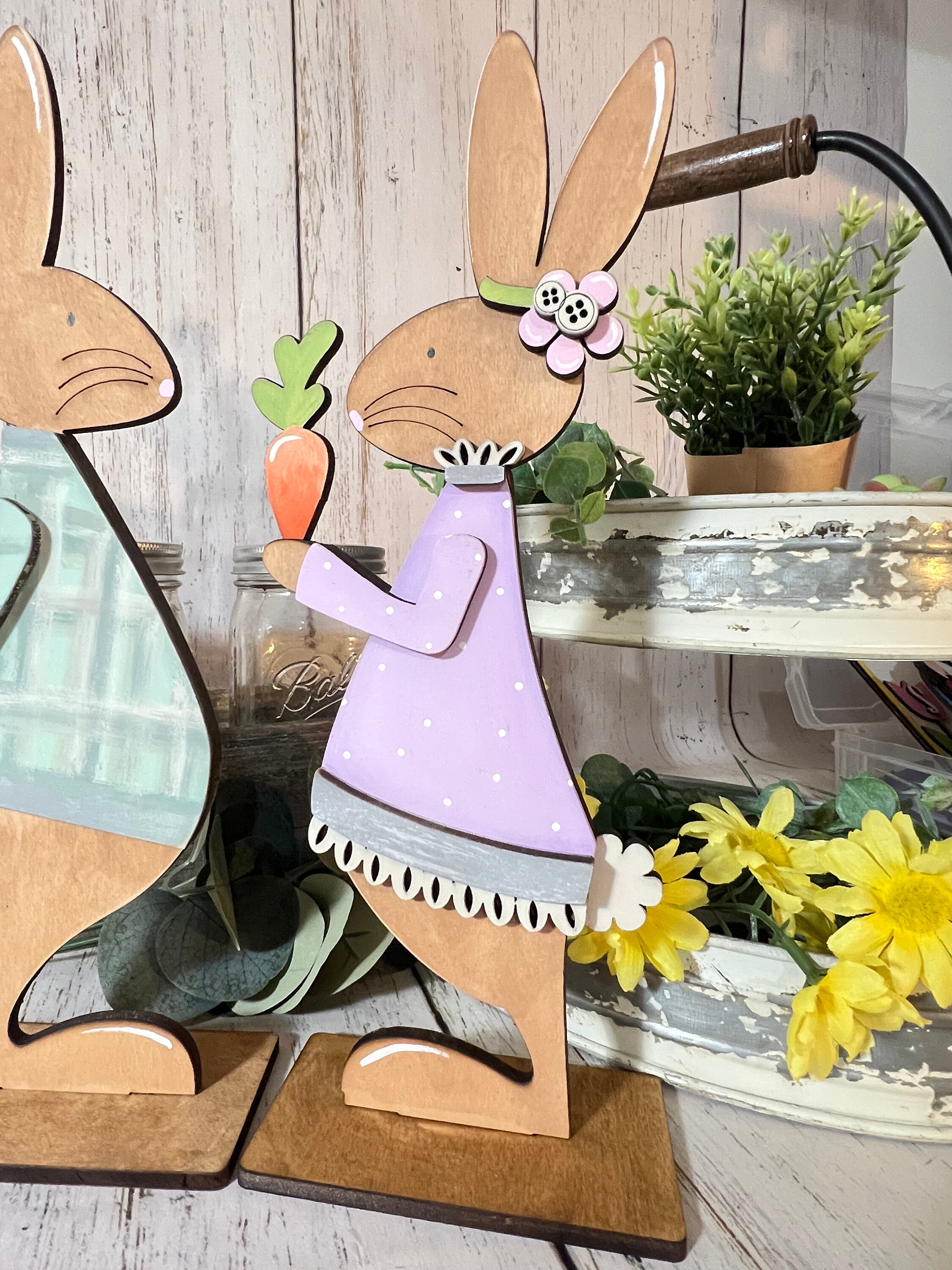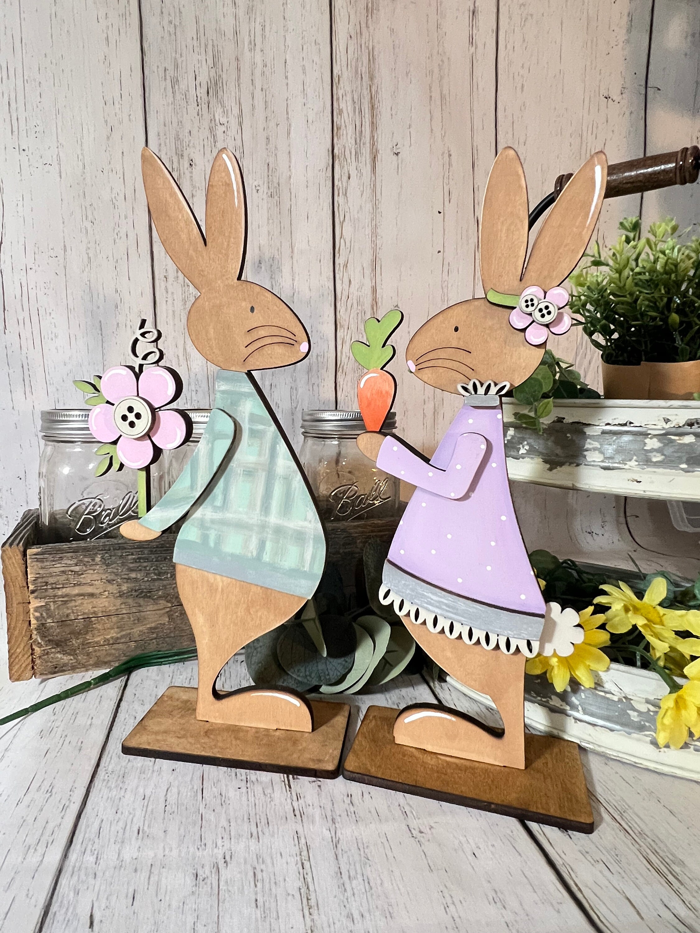 This wooden Easter bunny décor set includes two coordinating bunny figures designed to sit securely on shelves, mantels, tiered trays, countertops, or tabletops. One bunny wears a soft blue outfit holding a spring flower, while the other is dressed in a lavender dress holding a bright carrot, creating a playful and heartwarming scene that instantly adds seasonal charm.