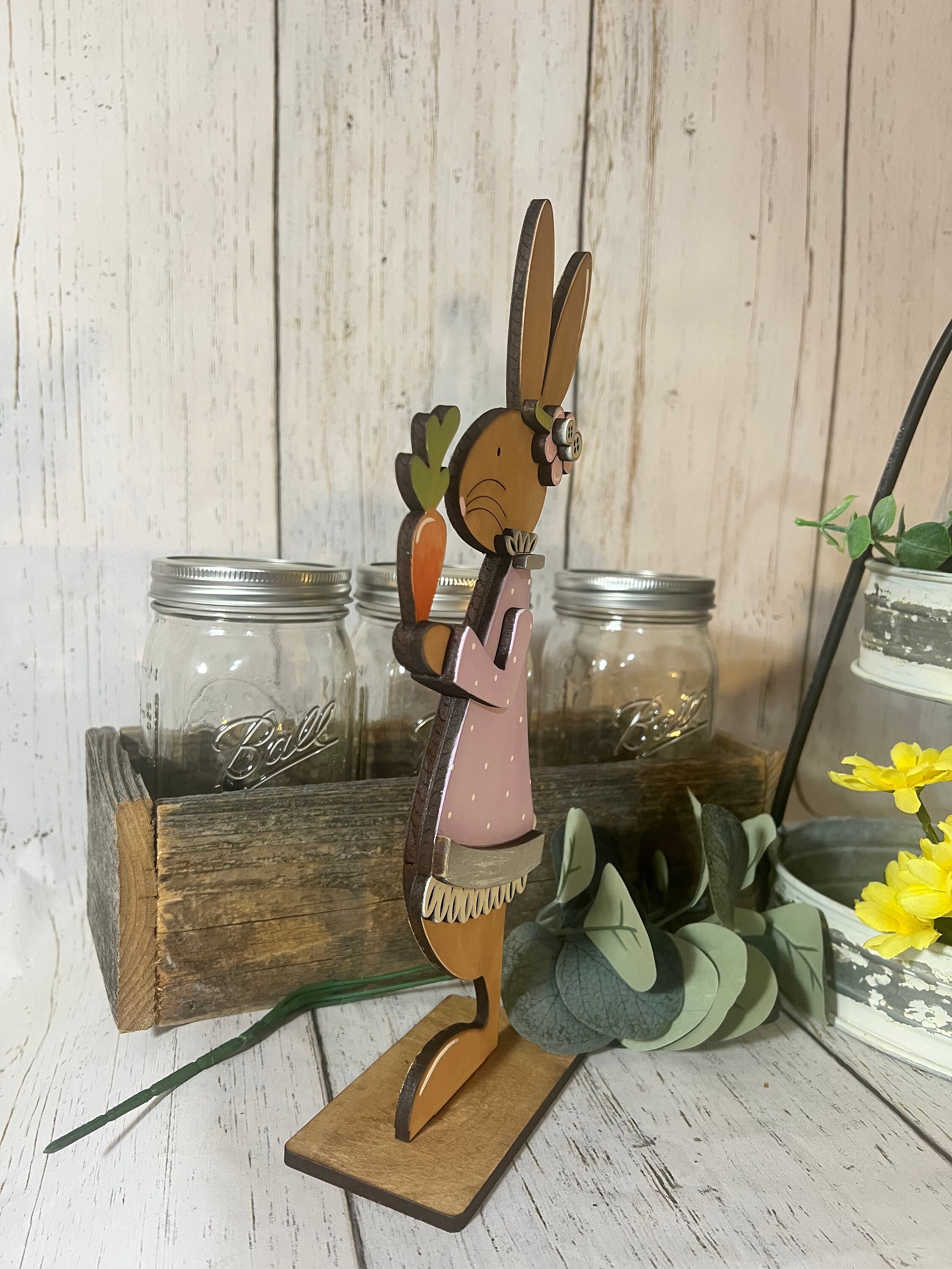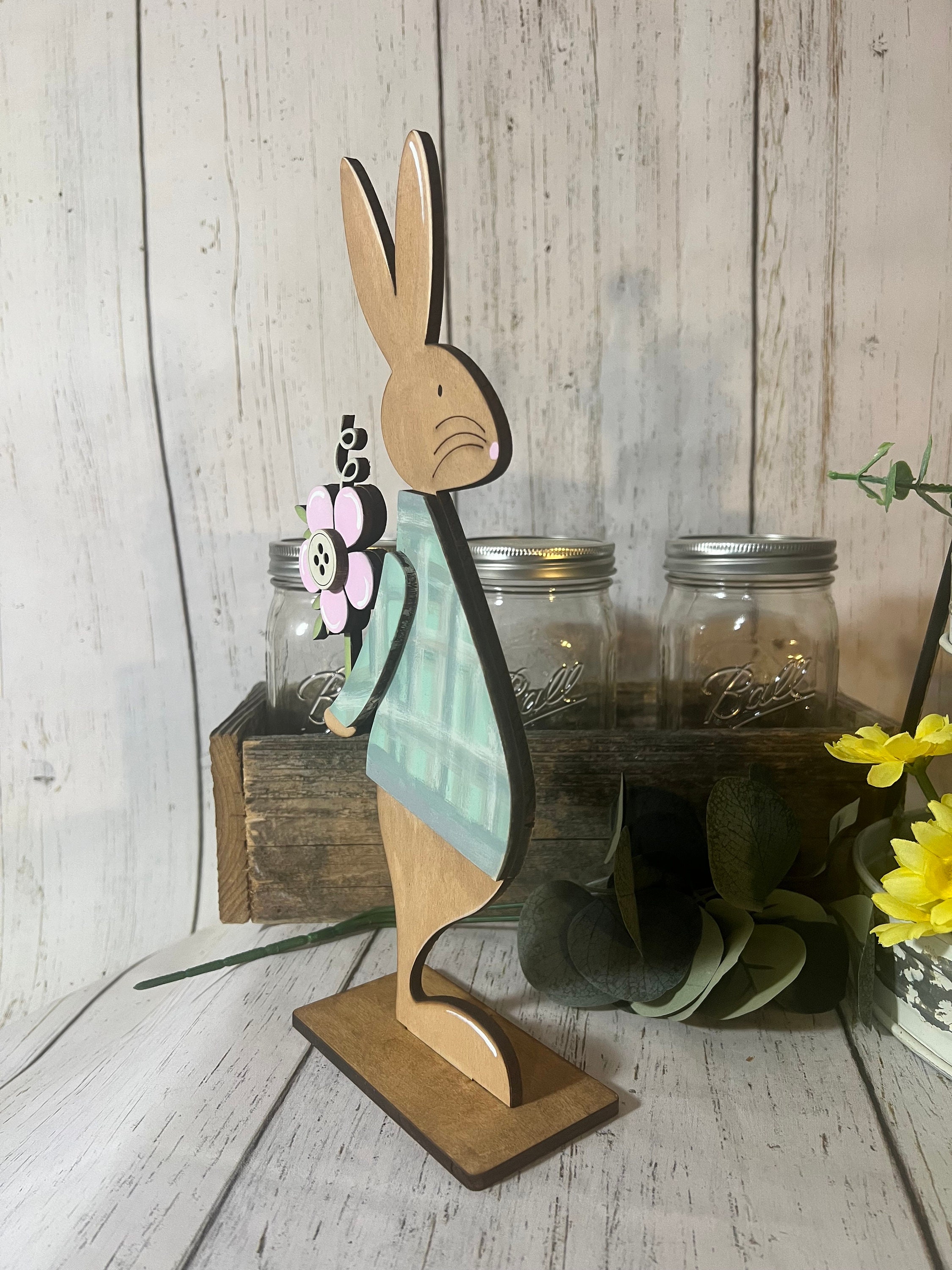 These Easter bunny shelf sitters are perfect for spring decorating, Easter celebrations, or everyday seasonal displays. They look beautiful on entryway tables, kitchen counters, mantels, shelves, office desks, or tiered trays. Their charming design makes them a favorite for farmhouse, cottage, and whimsical décor styles.