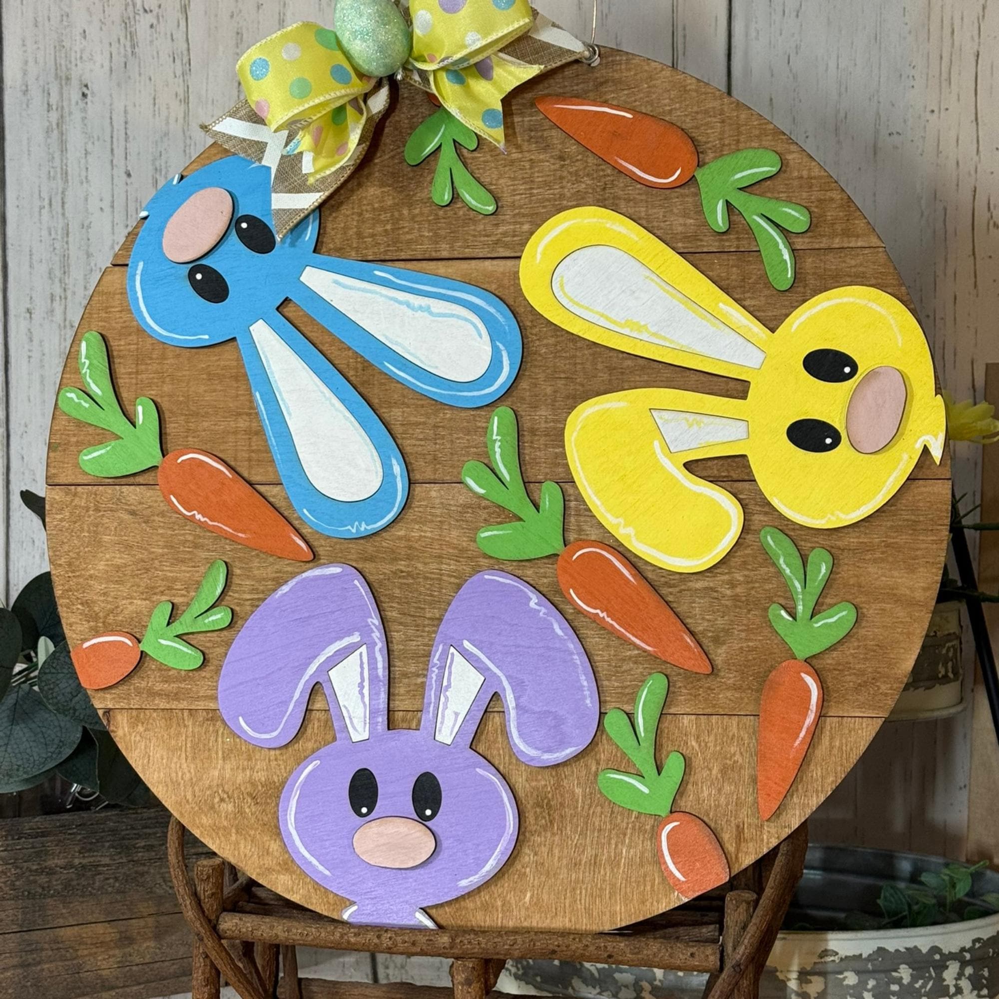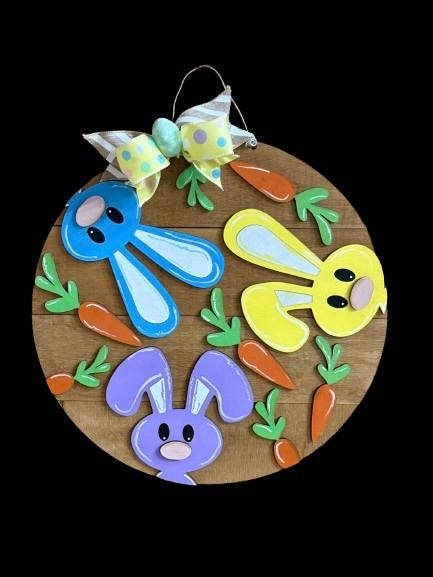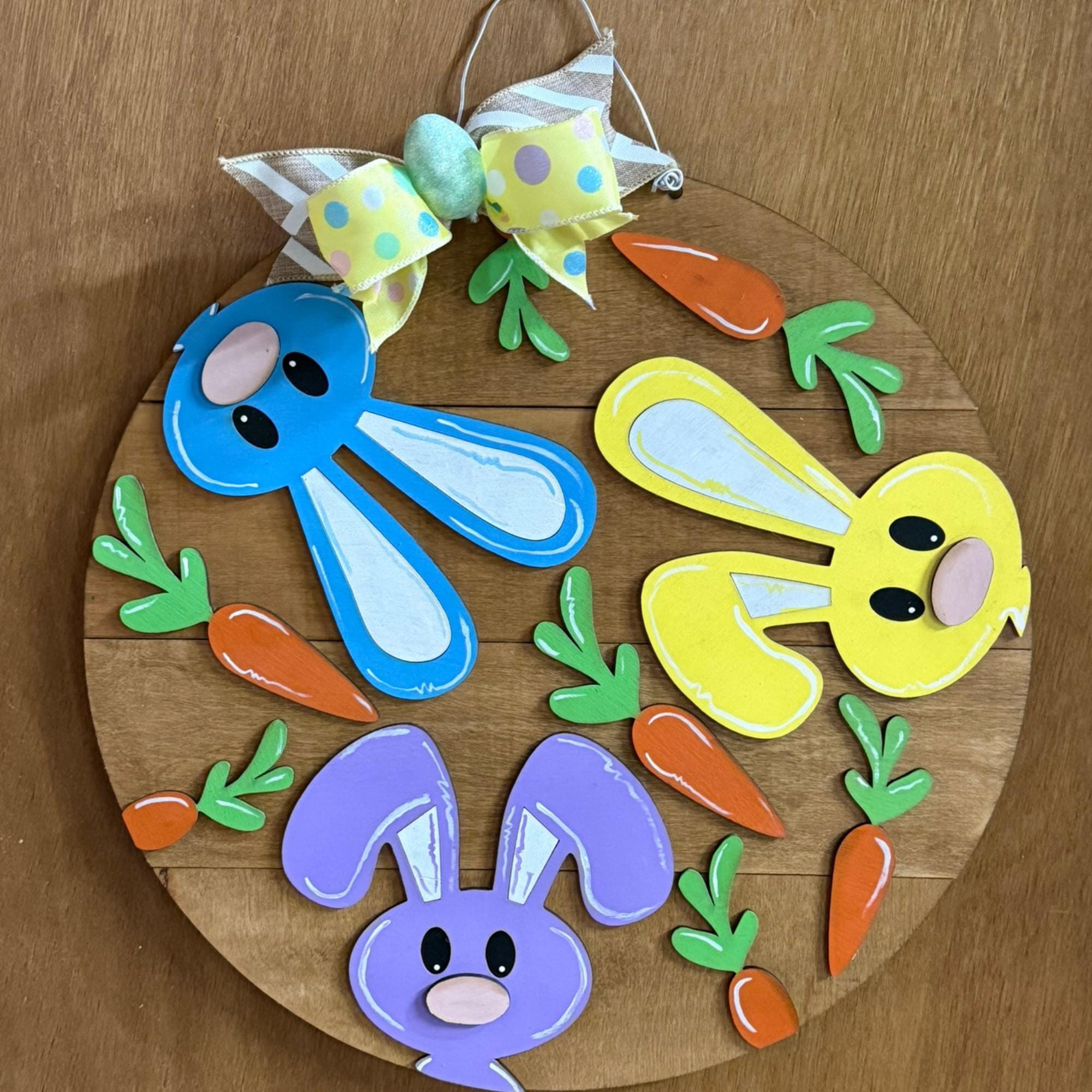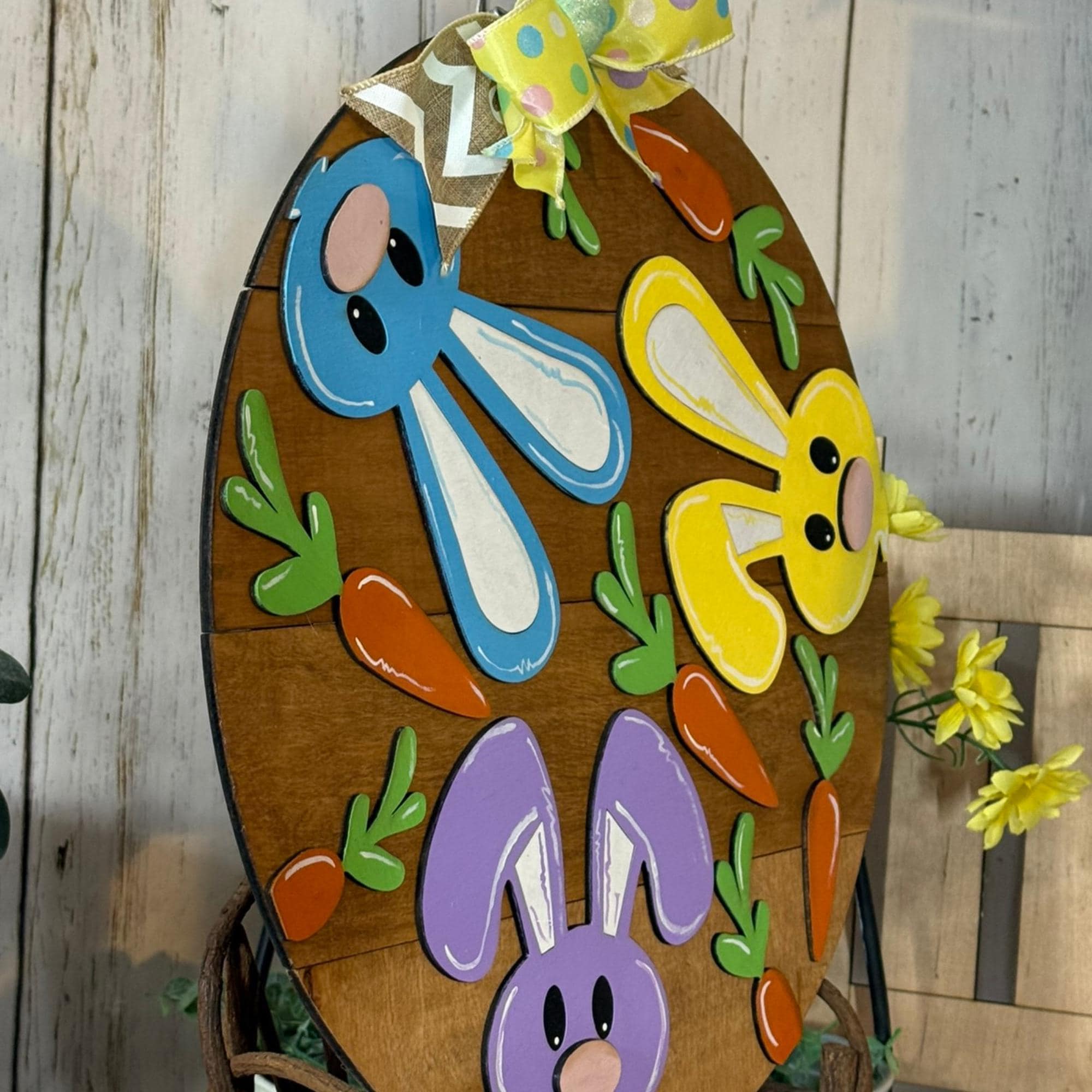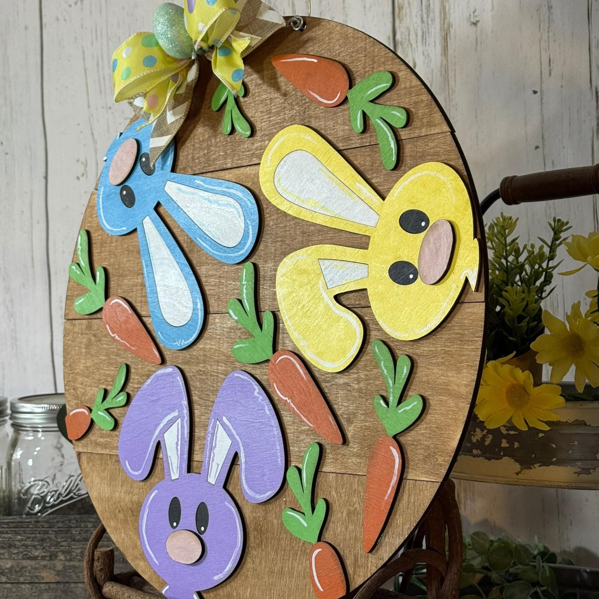 Welcome spring with this charming Easter bunny door hanger that adds a warm, whimsical touch to your front door. Featuring adorable bunnies surrounded by carrots and fun spring colors, this wooden door hanger is the perfect way to greet guests and celebrate the season. The sweet sign creates a welcoming feel that works beautifully for Easter and throughout spring.