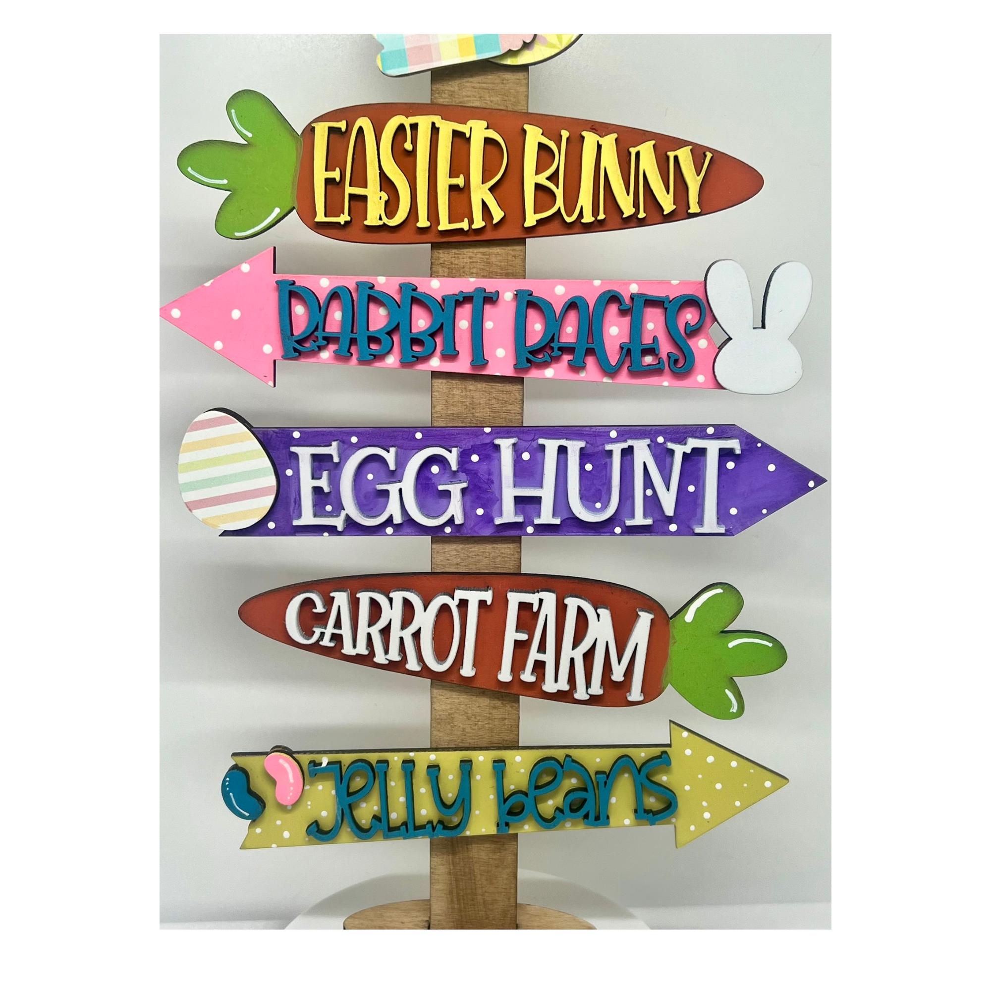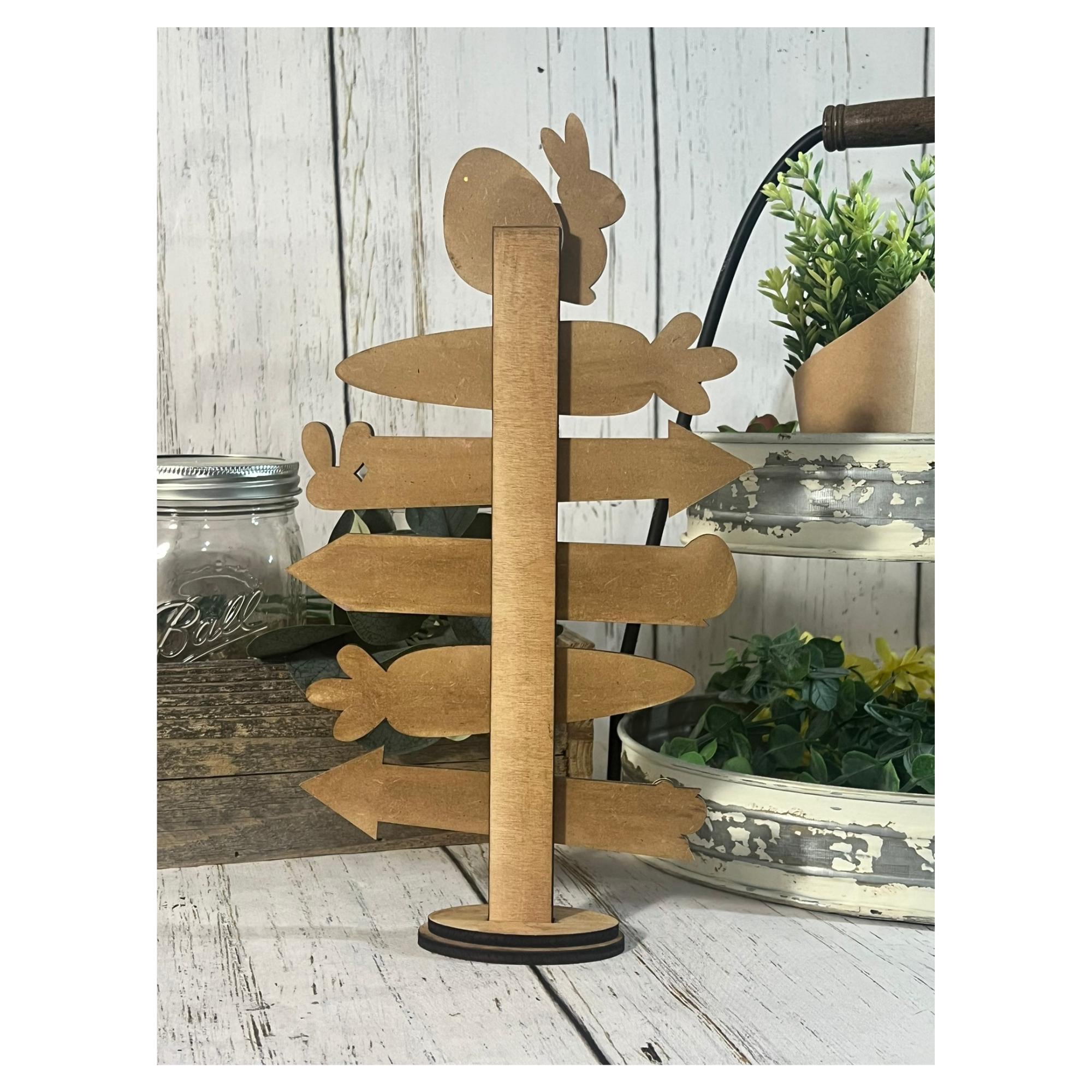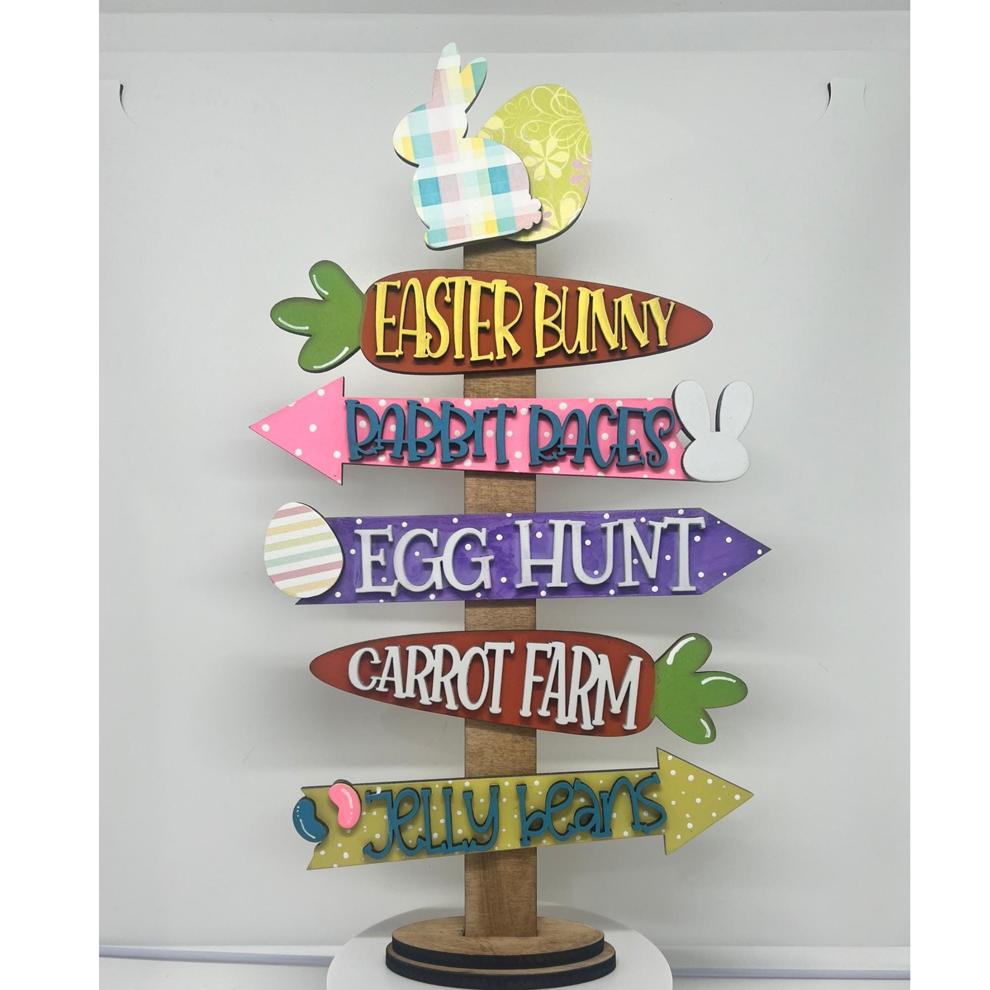 Add playful Easter charm to your spring décor with this colorful Easter shelf sitter sign. Featuring fun directional signs like “Easter Bunny,” “Egg Hunt,” and “Carrot Farm,” topped with an adorable bunny, this piece is perfect for shelves, mantels, tiered trays, entry tables, or countertops.