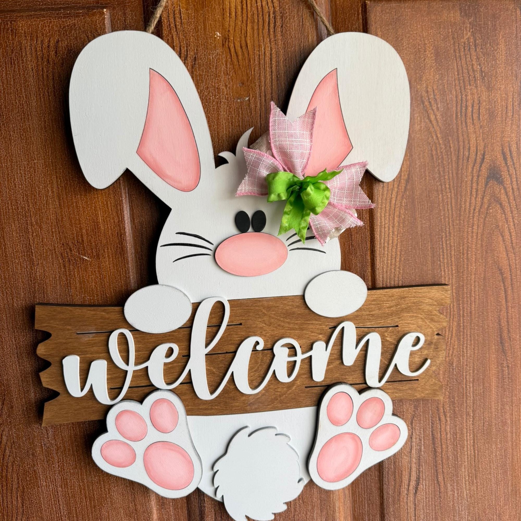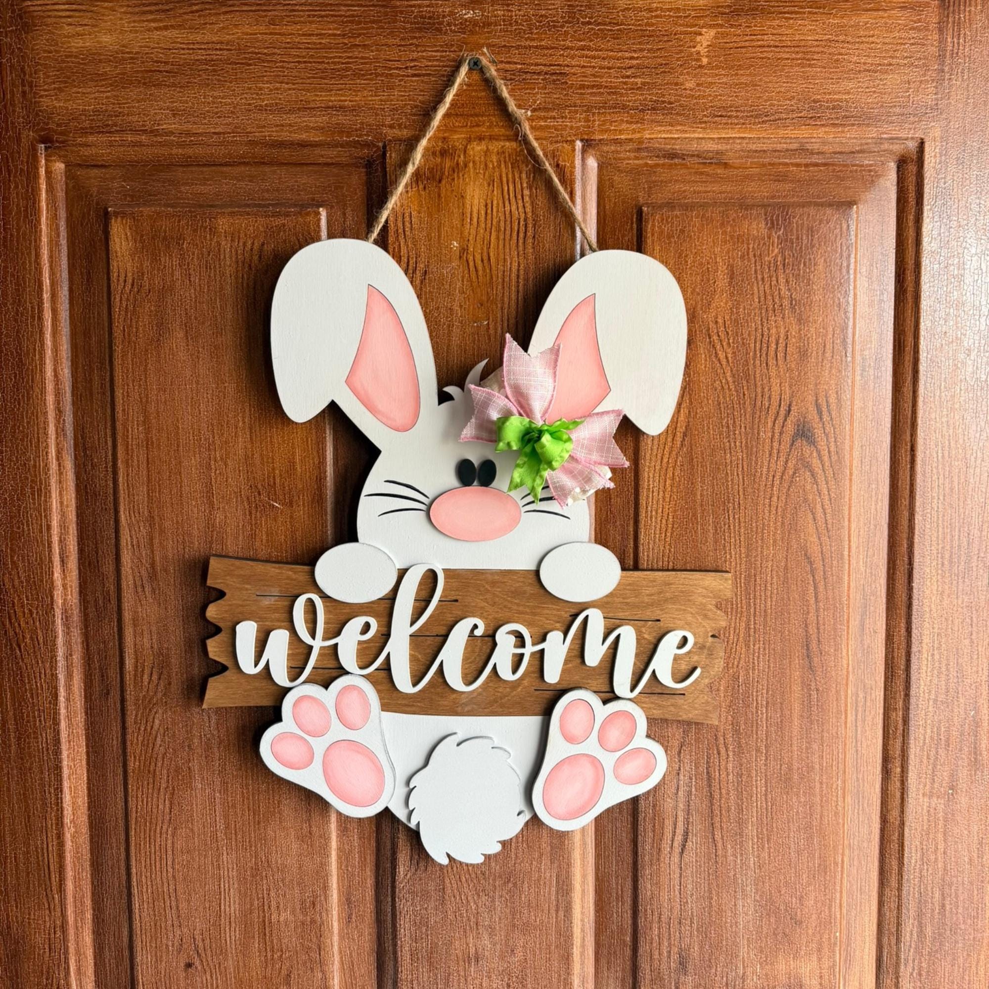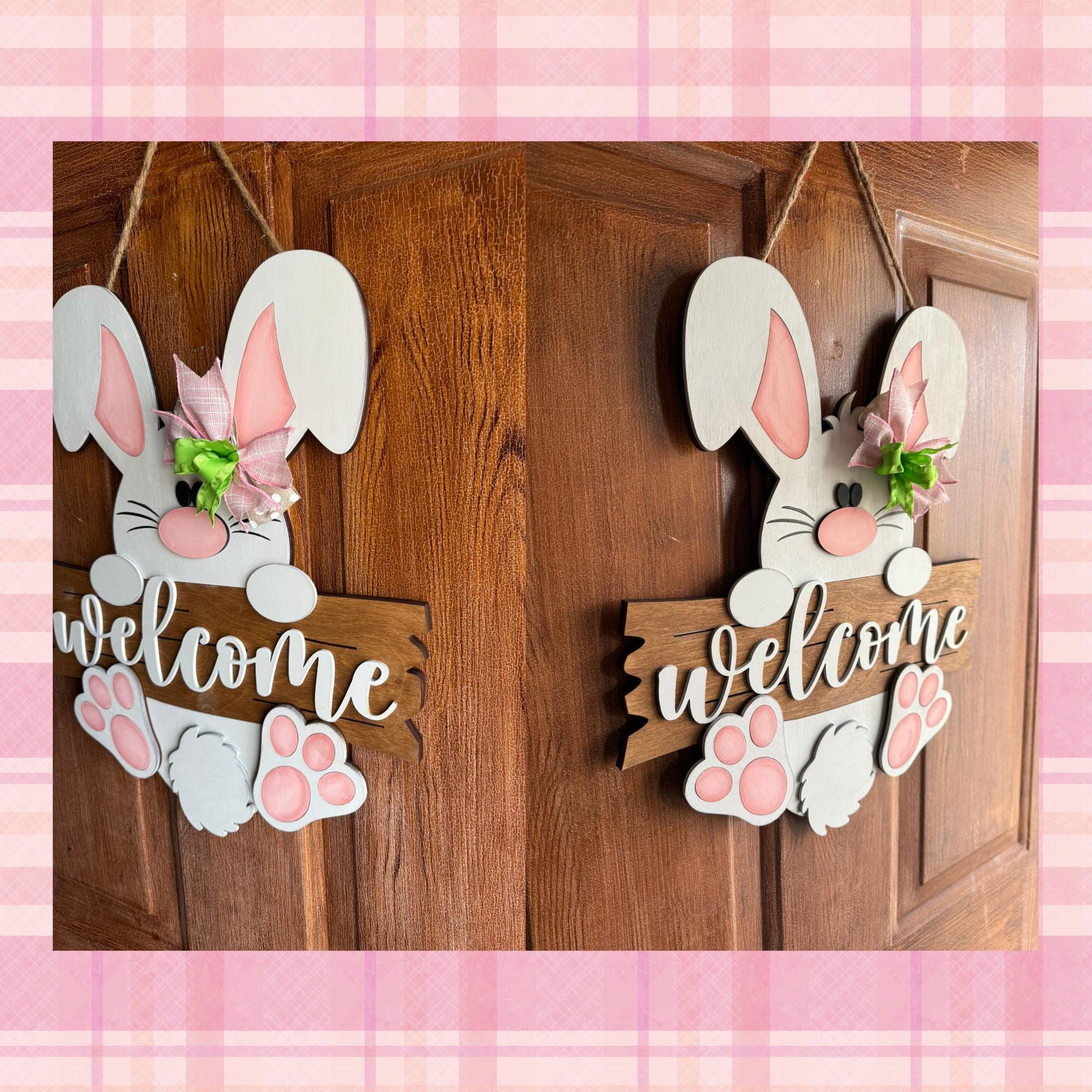 Welcome guests with the sweetest touch of spring! This adorable Easter Bunny door hanger features a charming wooden bunny peeking over a rustic-style “welcome” sign, complete with soft pink accents and a beautiful coordinating bow. It’s the perfect way to add cheerful Easter charm to your front door.