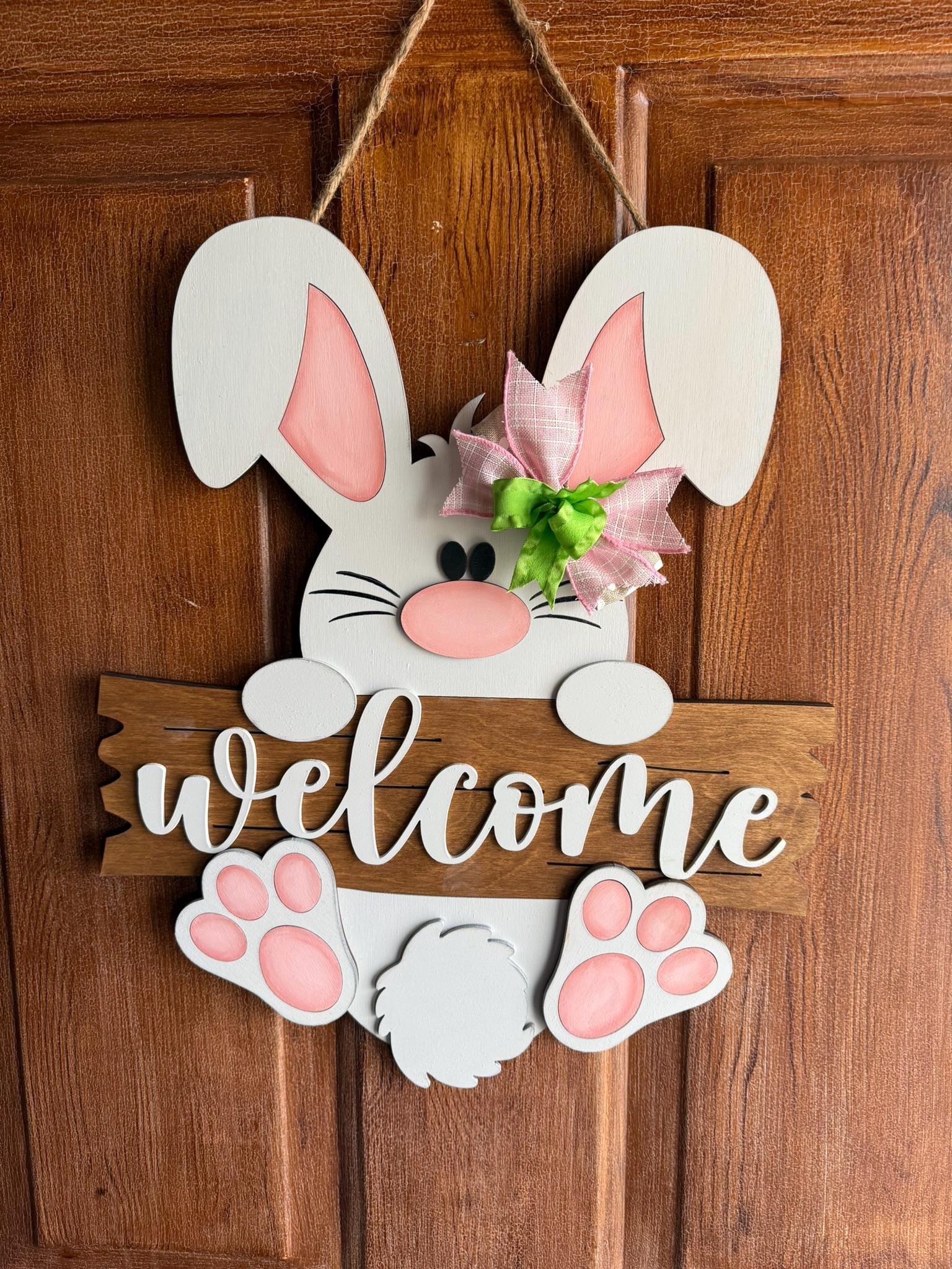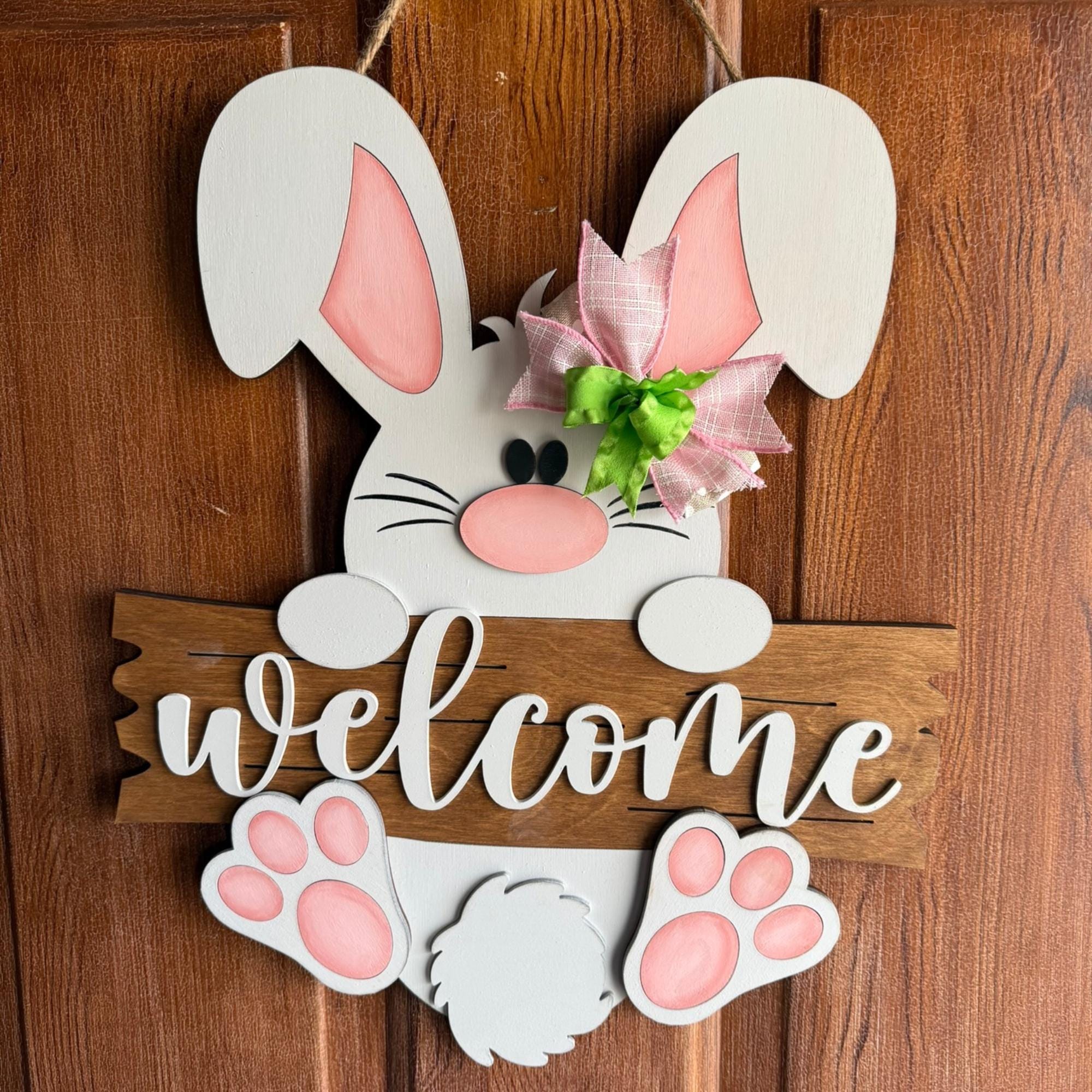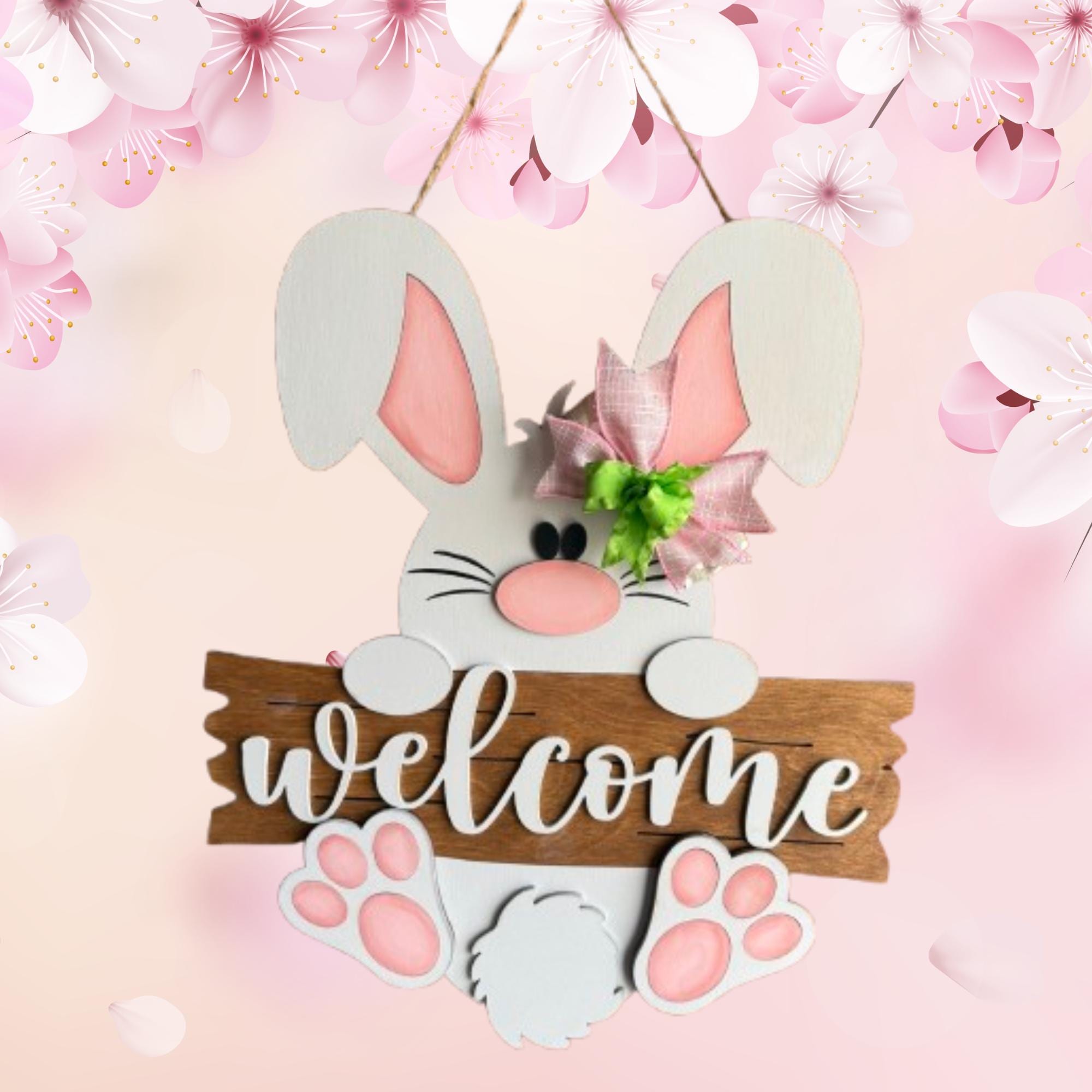 Welcome guests with the sweetest touch of spring! This adorable Easter Bunny door hanger features a charming wooden bunny peeking over a rustic-style “welcome” sign, complete with soft pink accents and a beautiful coordinating bow. It’s the perfect way to add cheerful Easter charm to your front door.
